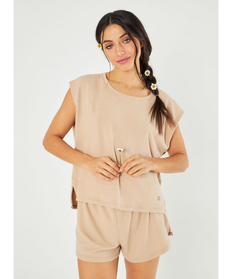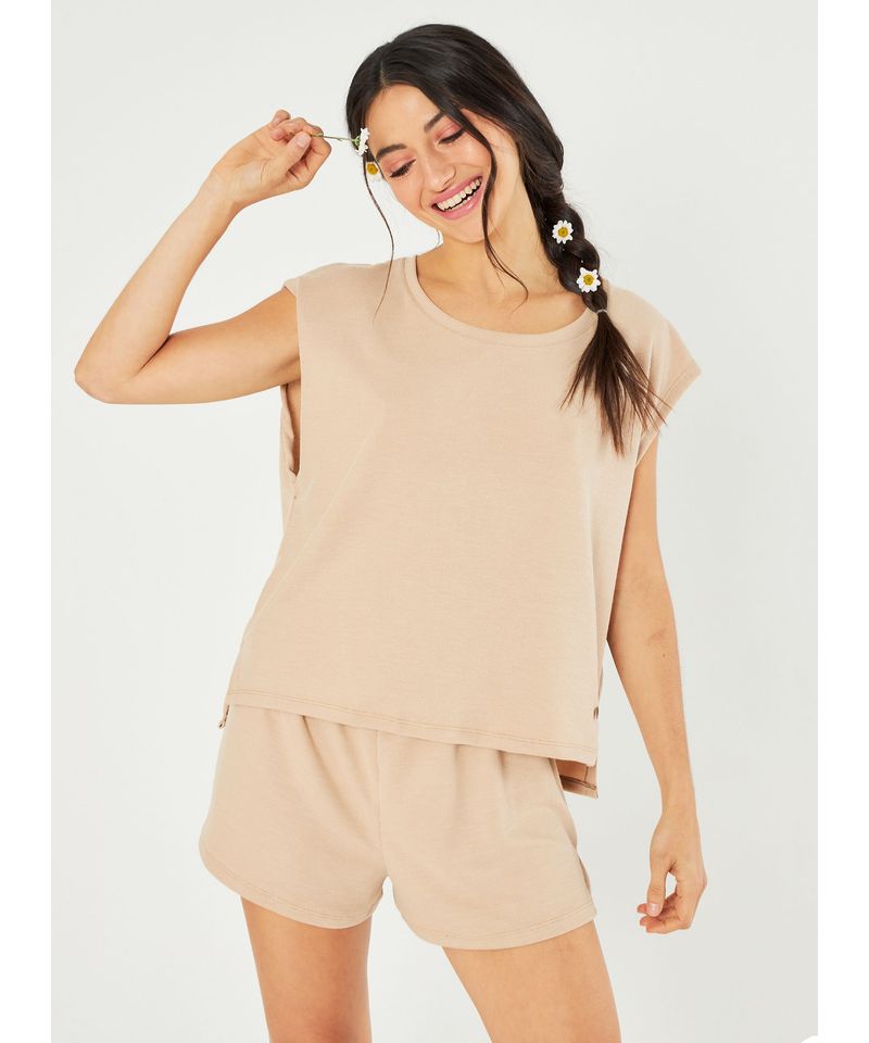 Relajado y versátil, el Conjunto Morley de Mood Up! es perfecto para sentirte cómoda sin perder estilo. Con musculosa amplia y short suelto, su caída ligera acompaña todos tus movimientos. Disponible en lila o beige.