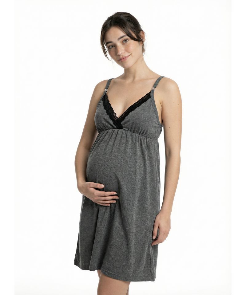 Cuenta con breteles regulables y prácticos broches de apertura frontal que facilitan la lactancia de manera simple y cómoda. Su diseño funcional y delicado la convierte en una prenda ideal para usar de noche o durante el día en casa.