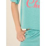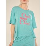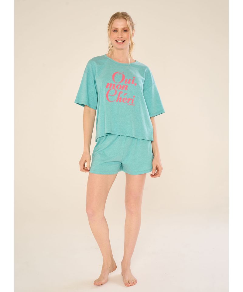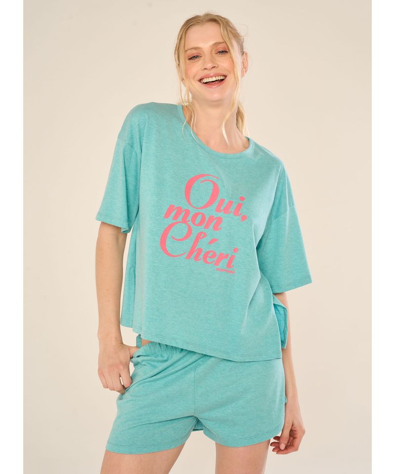 Viví la comodidad con el Pijama Amour de Mariené. Confeccionado con jersey de algodón, trae remera de mangas cortas con estampa “Oui, mon Chéri” y short a juego. Un diseño relajado, ideal para descansar o estar en casa con frescura.