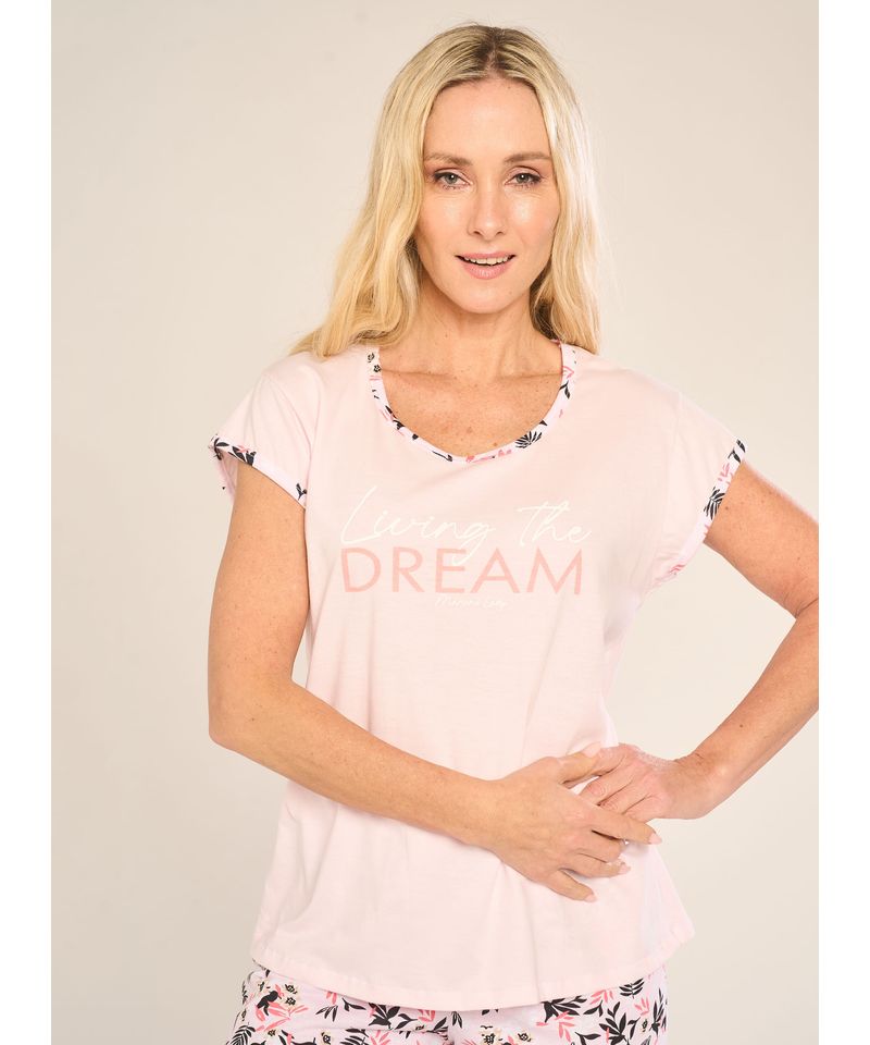 Pijama Dream plus size -Marca: Mariené -Línea: lady - verano 2026 -Colores: celeste - rosa -Talles: XL/54 - XXL/56 - XXXL/58 - XXXXL/60 -Tela: jersey estampado La modelo está utilizando talle S/48 SKU 2541E